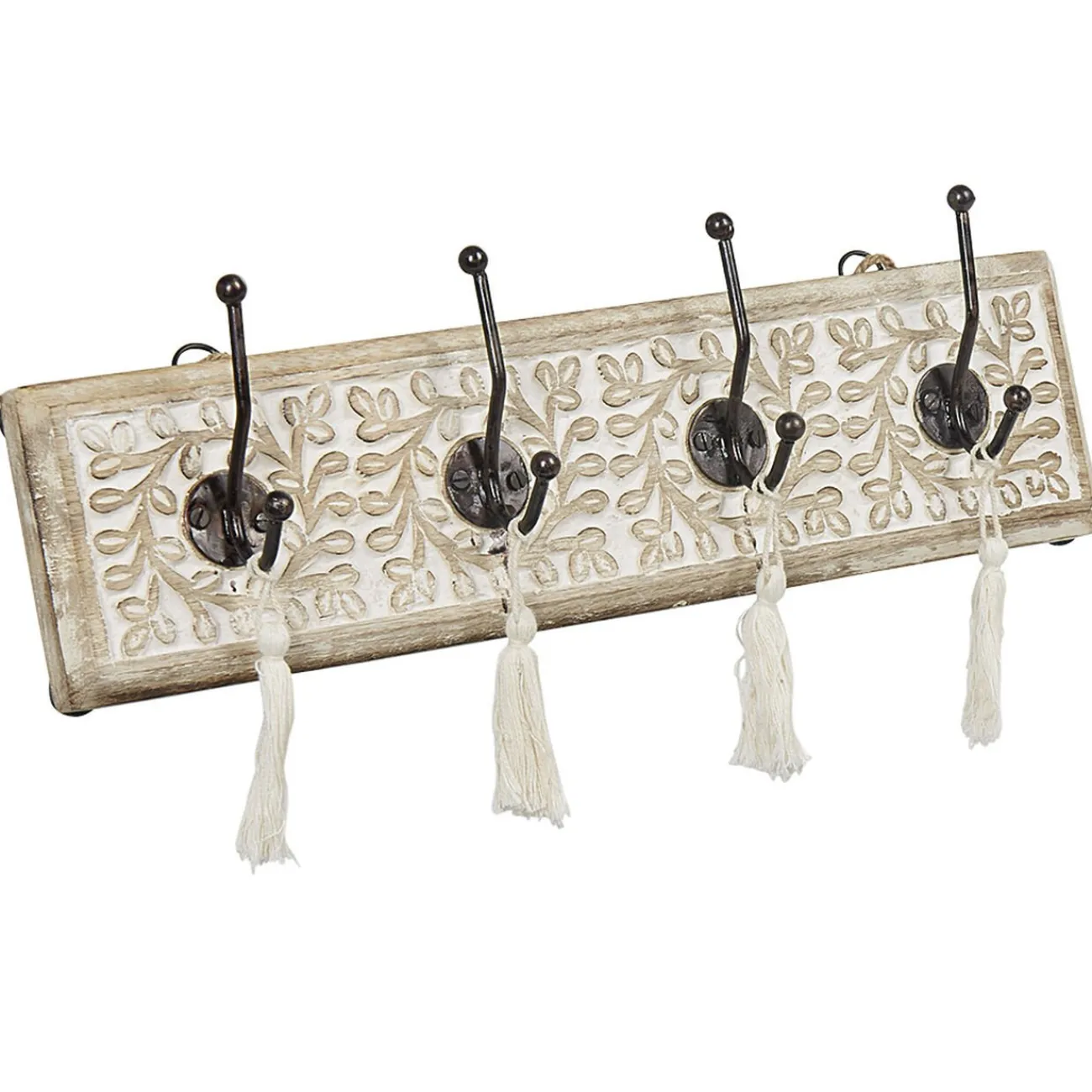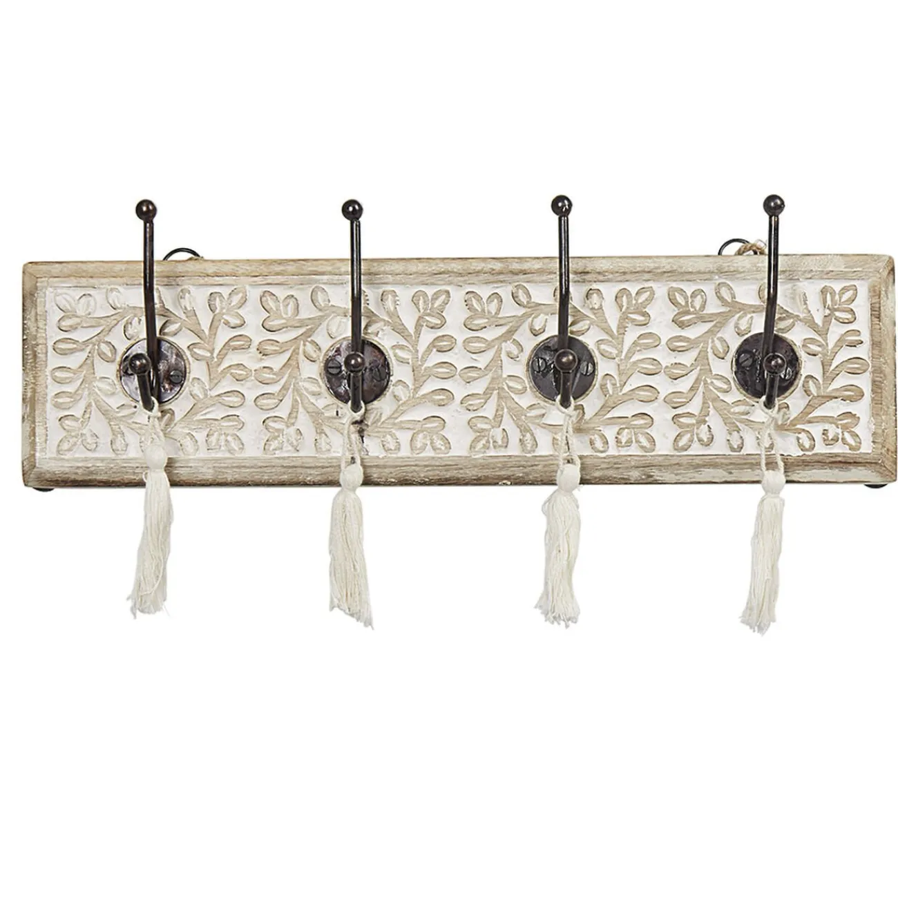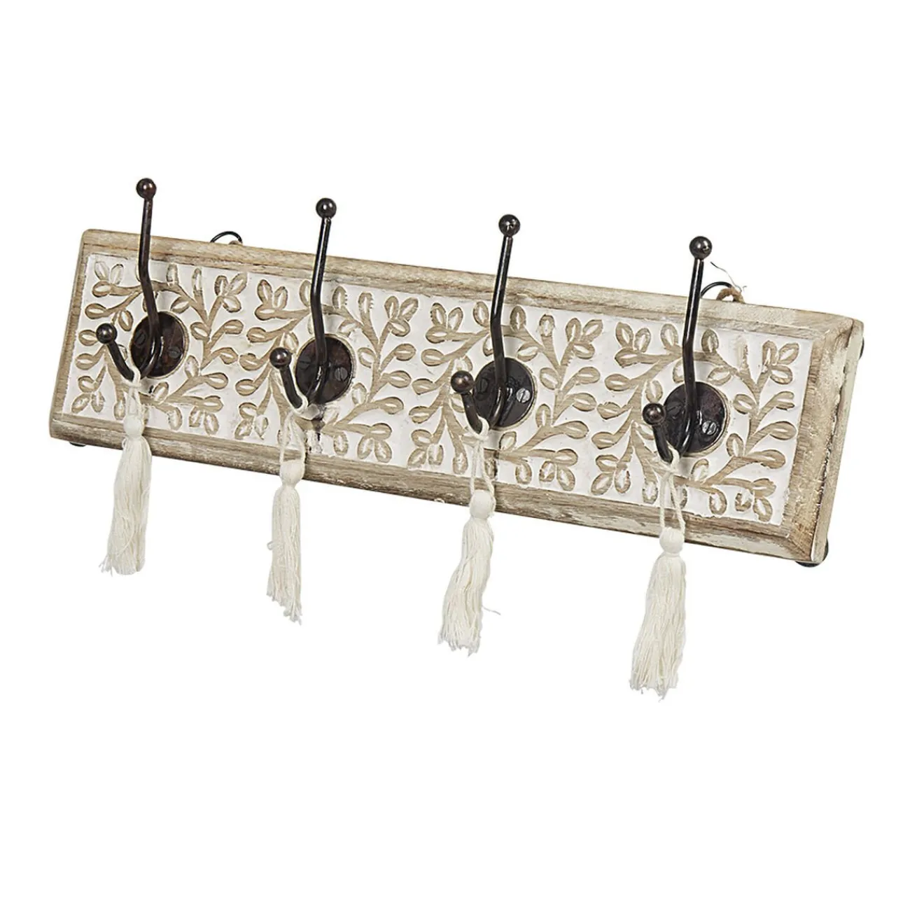 Habillez votre mur avec cette patère en manguier naturel motifs floraux sculptés dotée de 4 crochets noirs avec pompons beiges.