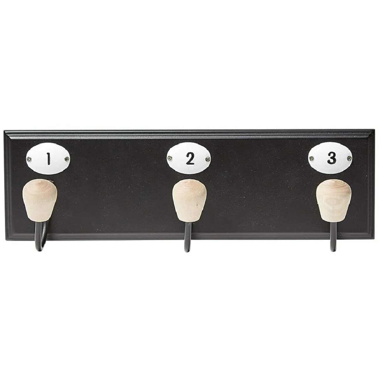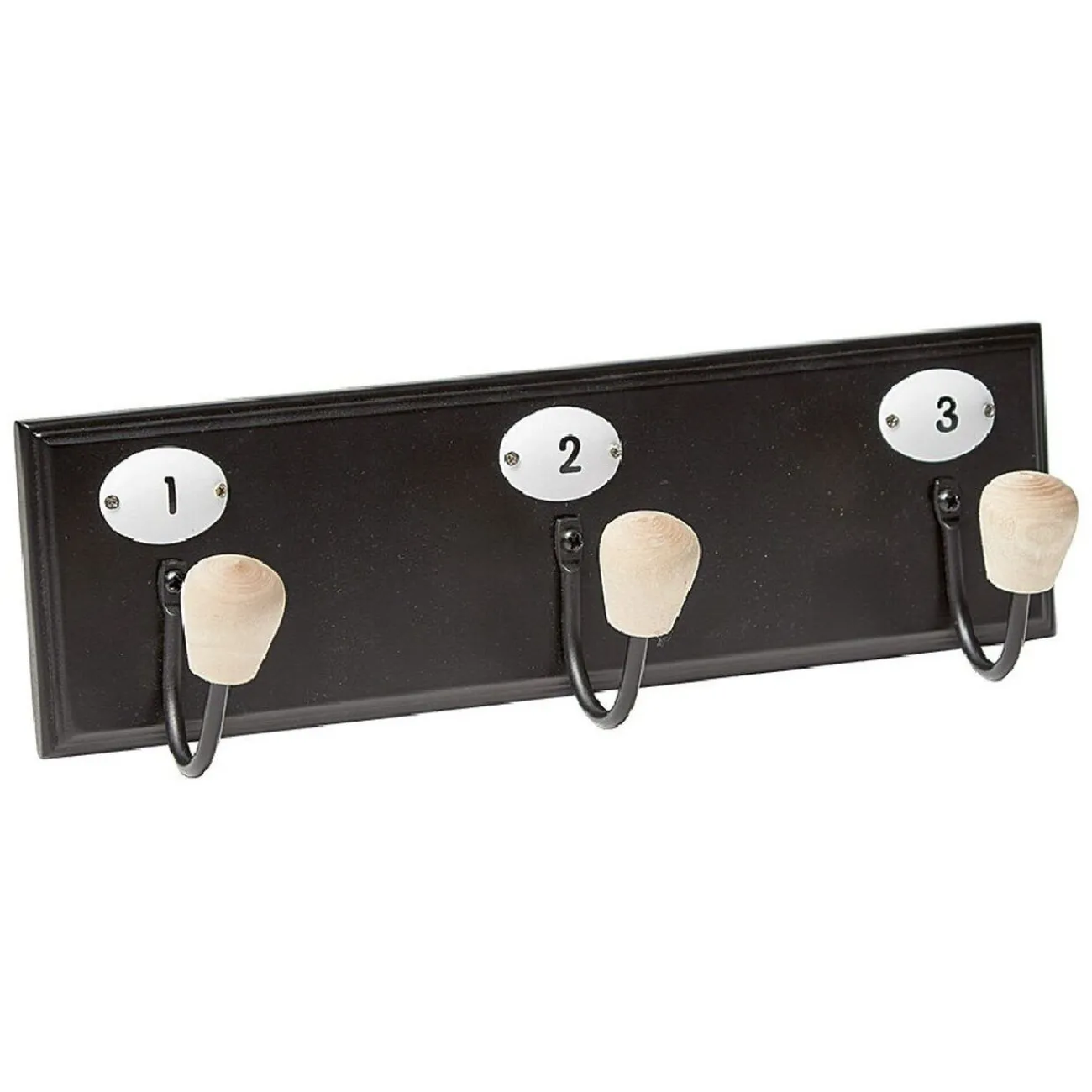 Patère murale en métal noir composée de 3 crochets en bois et décorée des chiffres 1, 2 et 3.