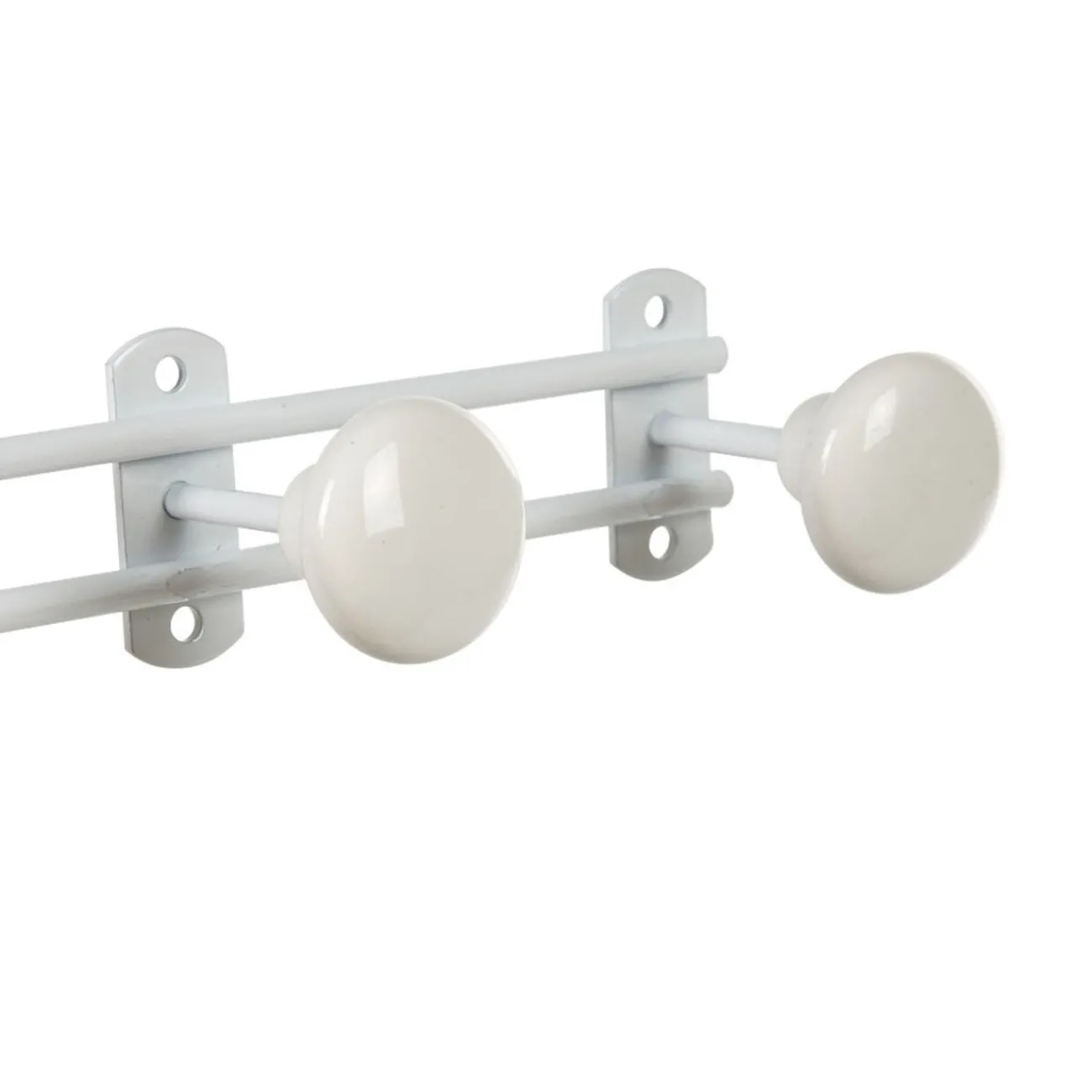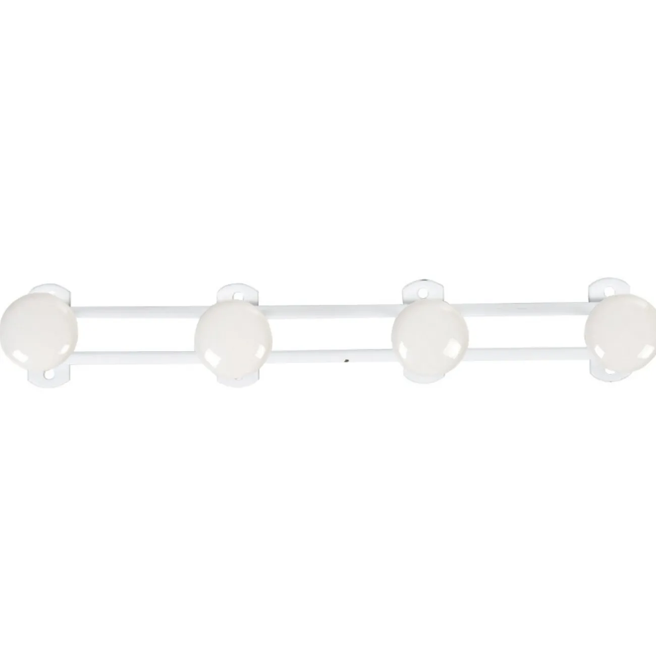 Patère murale en métal blanc et doté de 4 crochets en forme de boule. Discrète et très pratique pour suspendre vos affaires dans l’entrée ou d’autres pièces de votre intérieur.