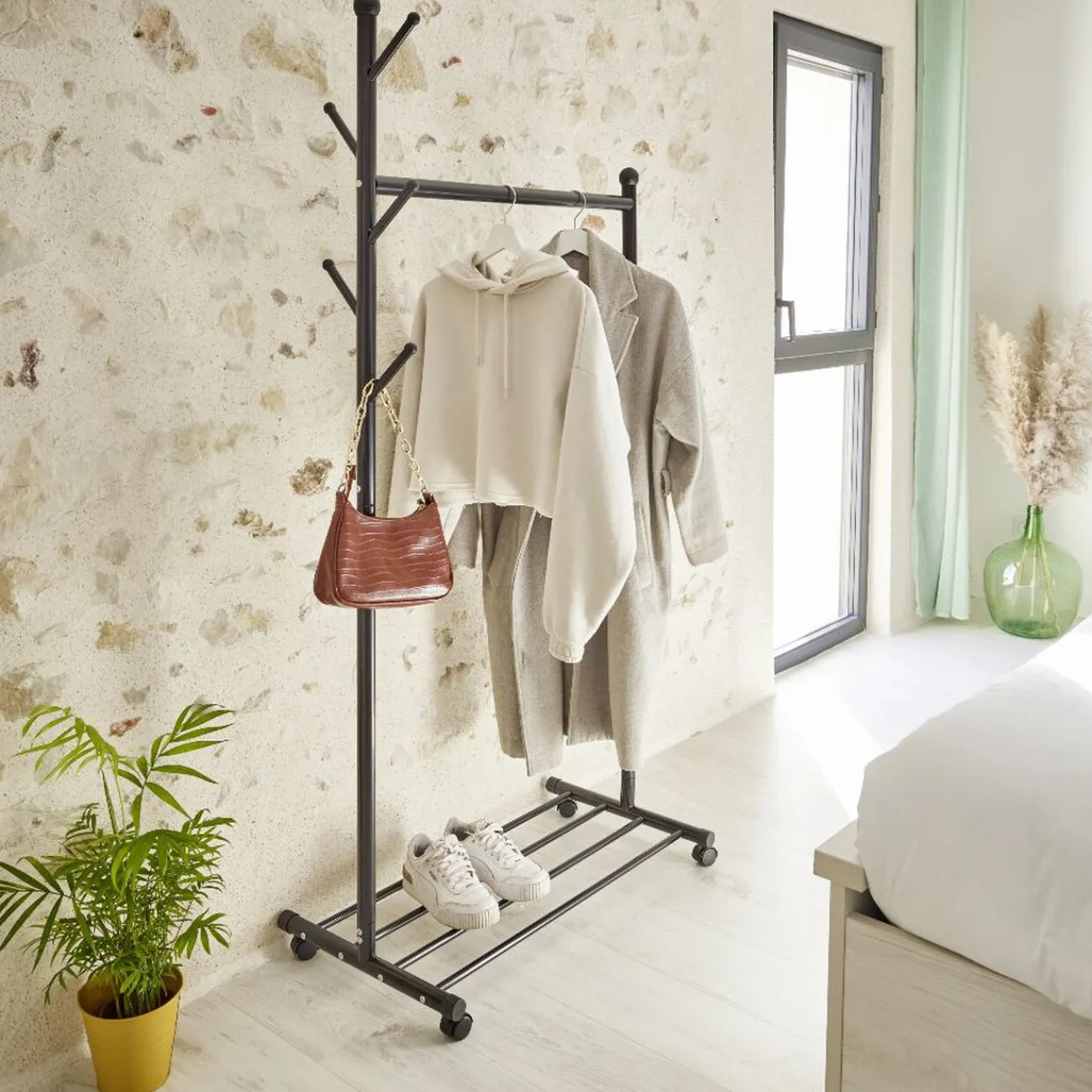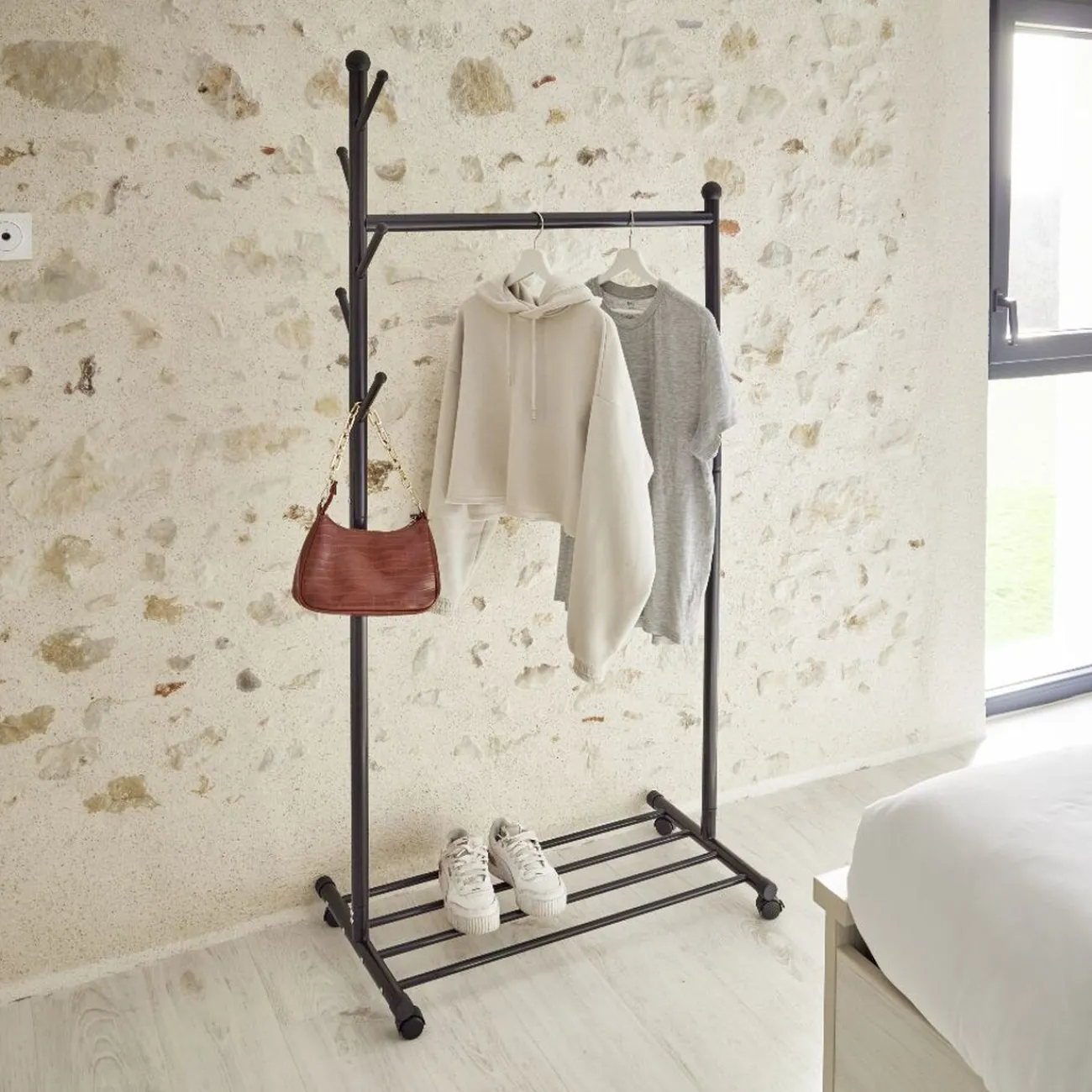 Monté sur roulette, ce portant est facile à déplacer d’une pièce à l’autre. 3 en 1, il comprend :