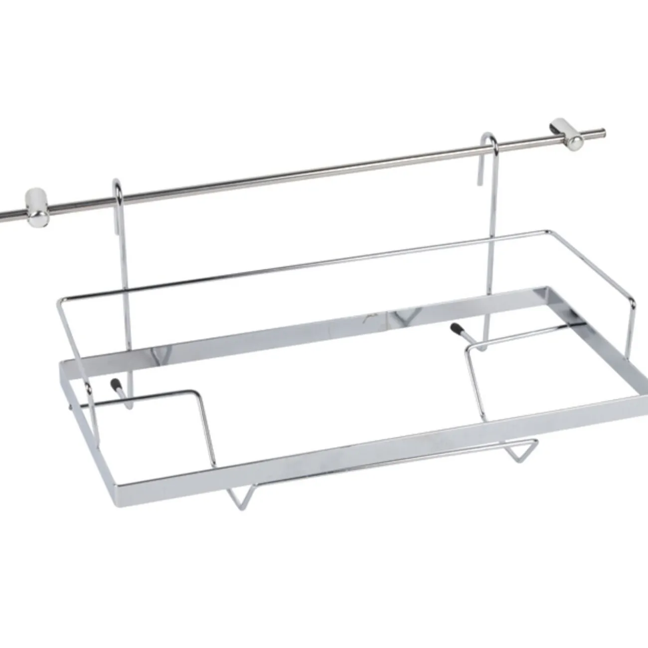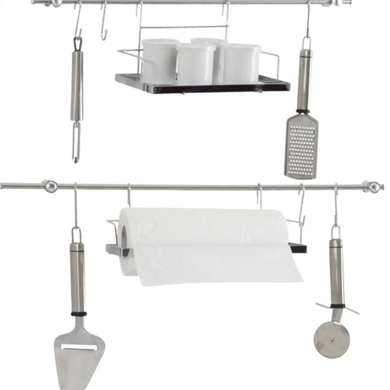 Rangement de cuisine à suspendre contenant : 1 support essuie-tout, 6 crochets, 2 barres L. 58 cm avec système d’accroche et 1 étagère, métal chromé.