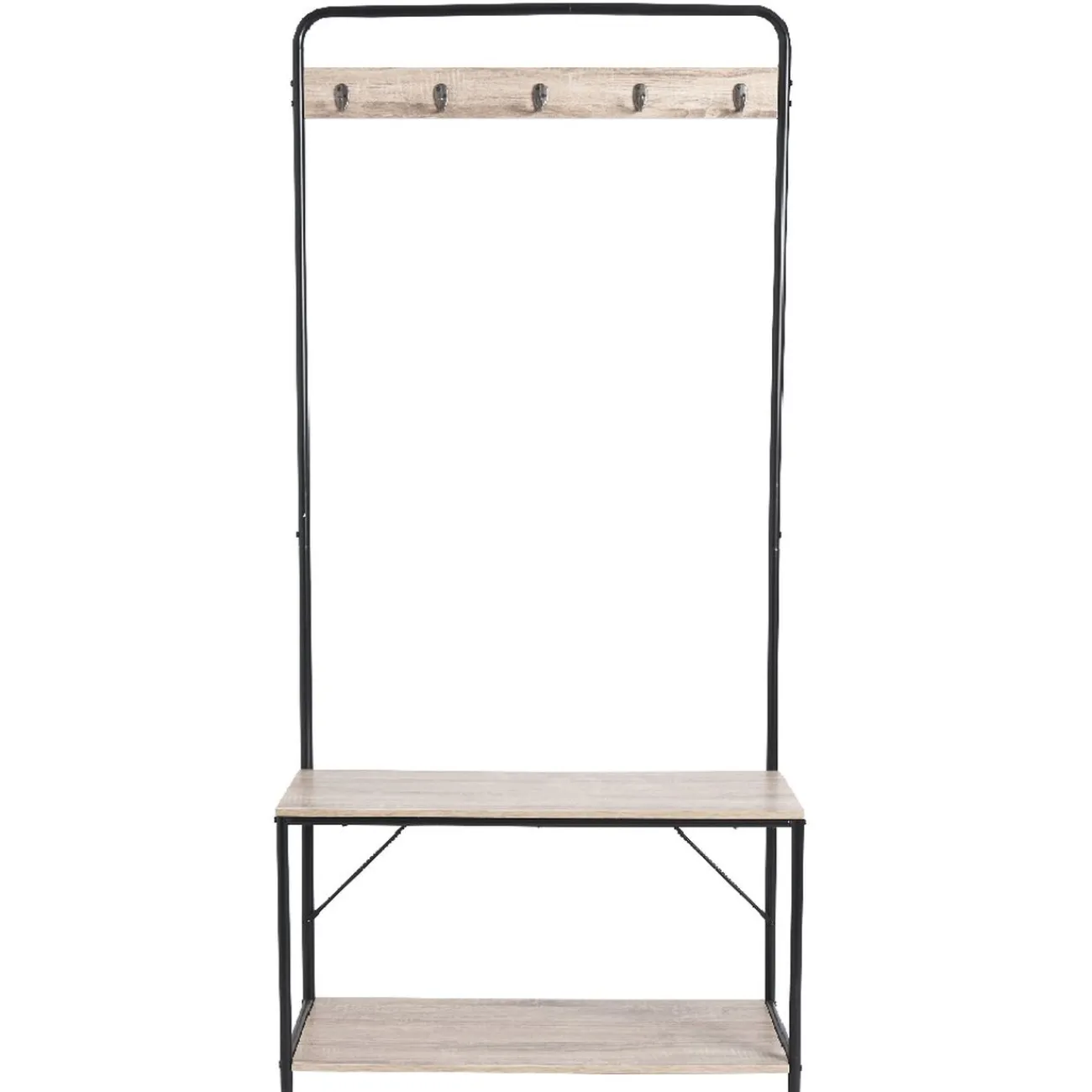 Ce vestiaire à la structure de métal noir avec un banc et une étagère en bois, tendance et peu encombrant, sera idéal pour se chausser dans l’entrée et se couvrir avant de sortir. Déposez les manteaux de toute la famille sur la penderie, les chaussures sur l’étagère du bas et aidez-vous du banc pour mettre vos chaussures ou laissez-le accueillir les sacs à main et autres accessoires.