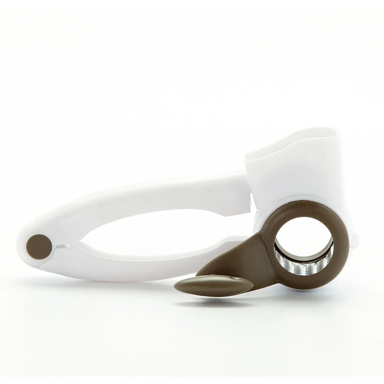 Râpe à fromage blanche et taupe, en plastique et inox.