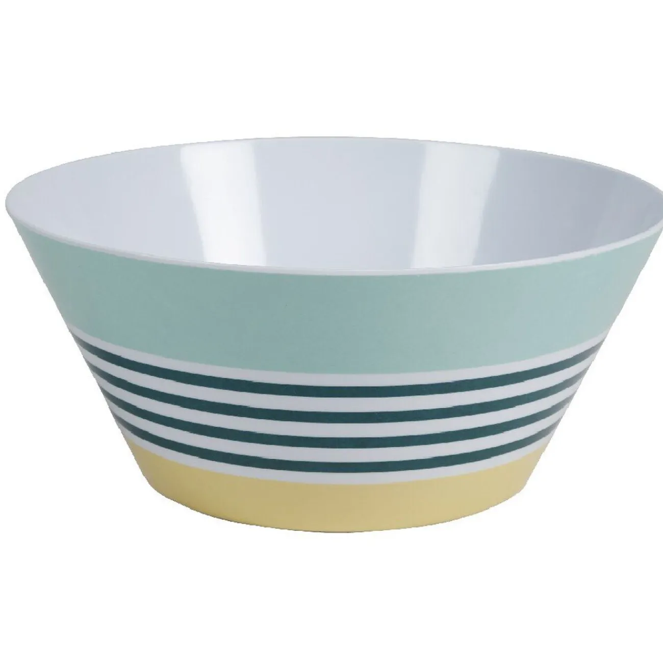 Saladier en mélaminé avec motif bayadère rayures dans les tons bleu jaune et vert. Collection Caraïbes