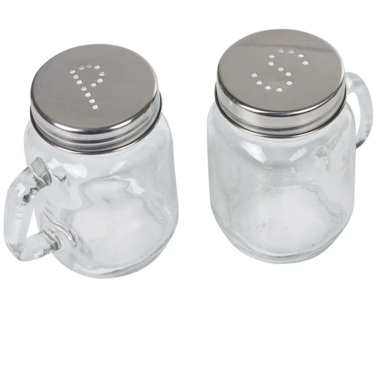 Salière et poivrière en forme de mug transparent avec couvercle gris.