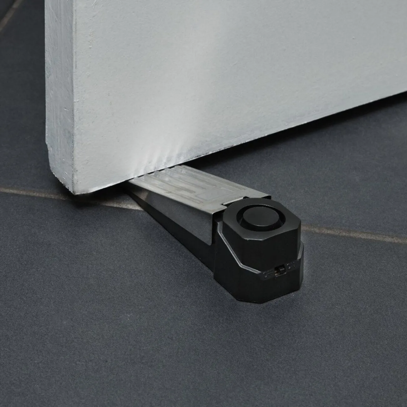 Système d’alarme à placer à la base d’une porte, sert de butée de porte et émet un bruit perçant lorsqu’elle se déclenche.