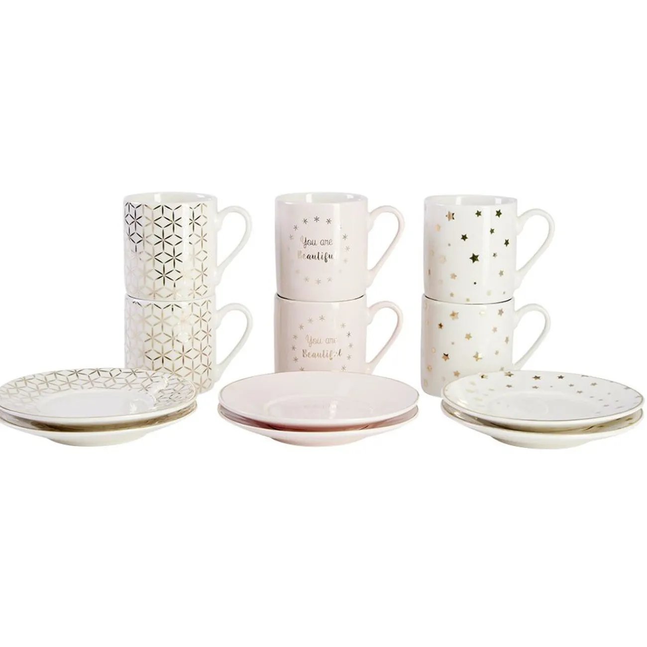 Service à café composé de 6 tasses au design multicolore et 6 sous-tasses assorties.