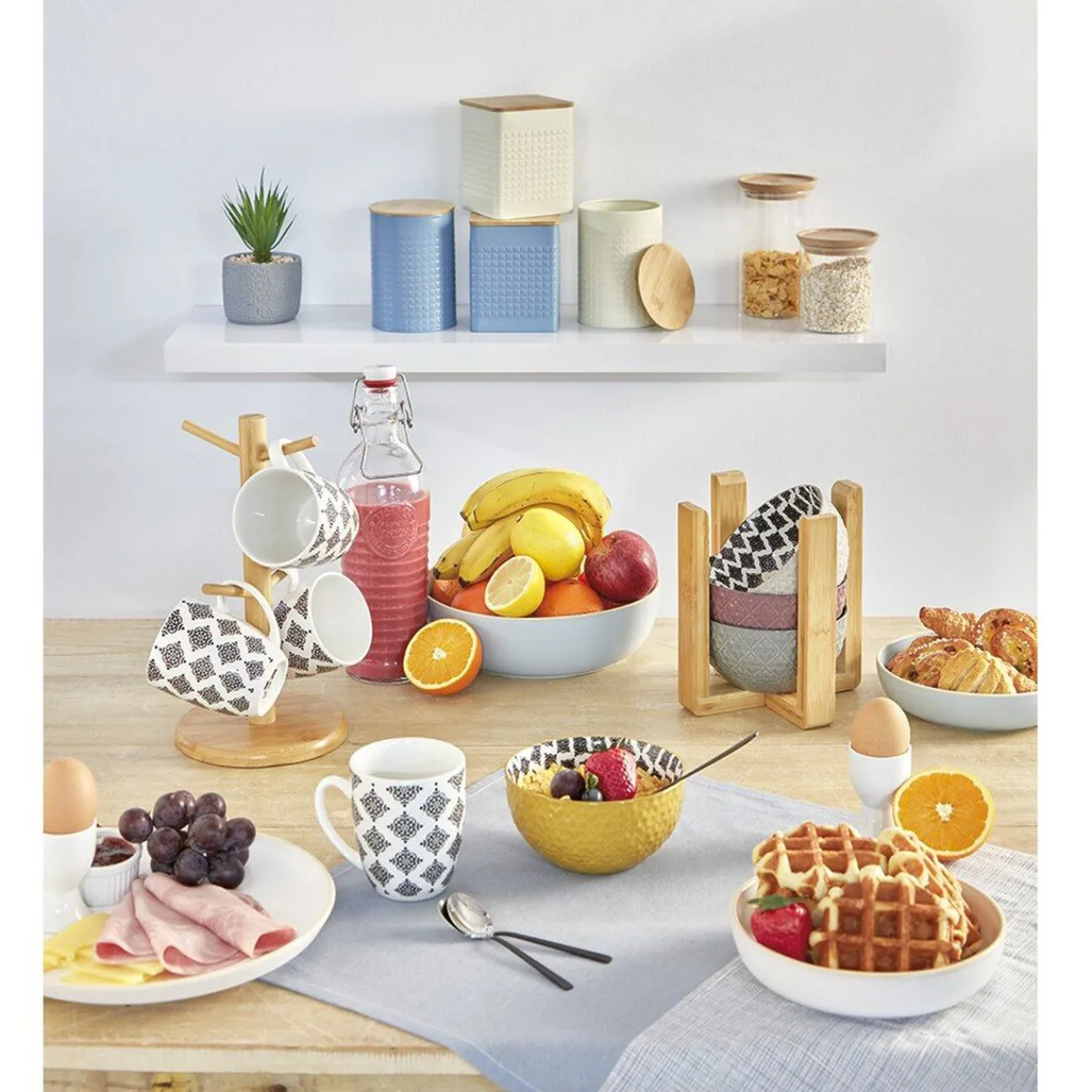 Gifi Set 4 mugs décor arabesque noir et blanc et support en bambou