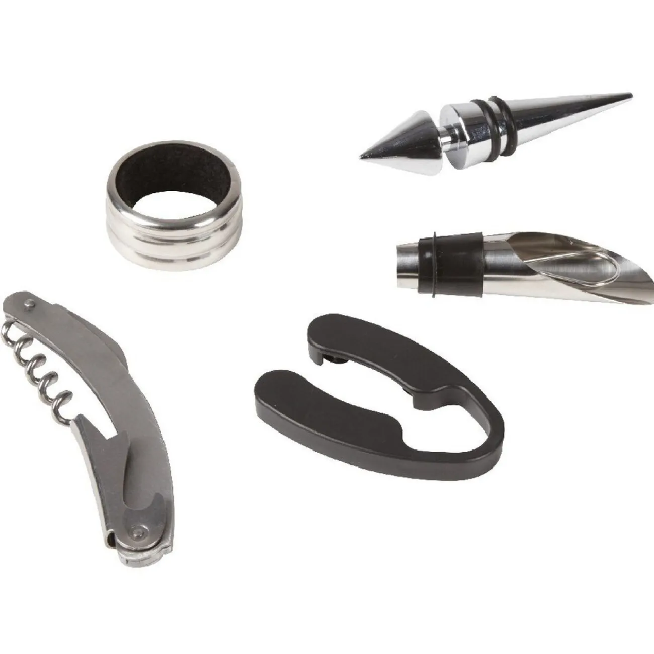 Comprend : 1 anti-goutte, 1 tire-bouchon, 1 bec verseur, 1 découpe-capsule et 1 bouchon, métal.