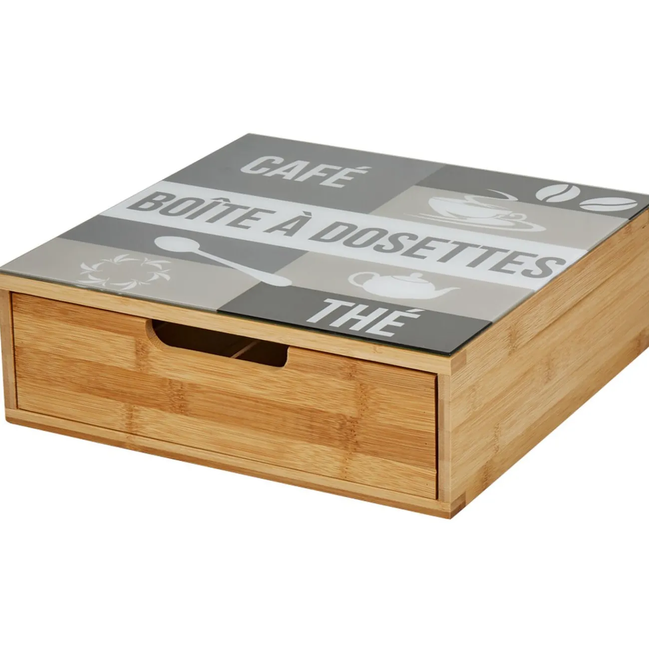 Tiroir toutes dosettes de couleur gris, blanc et naturel.