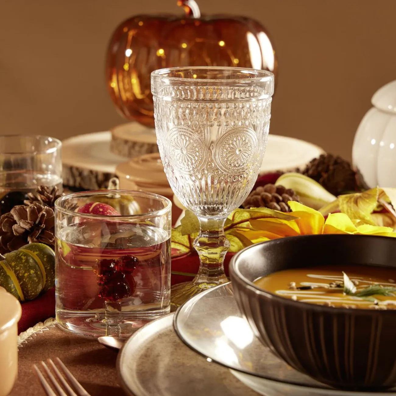 Découvrez le verre à pied en verre avec motif baroque, idéal pour apporter une touche d’élégance à vos réceptions.