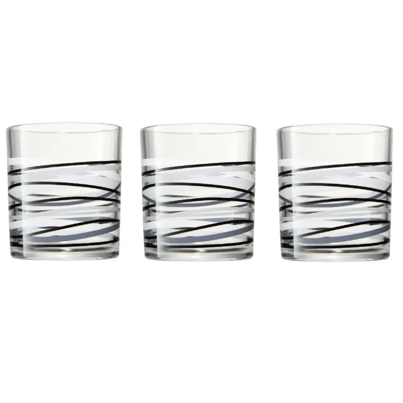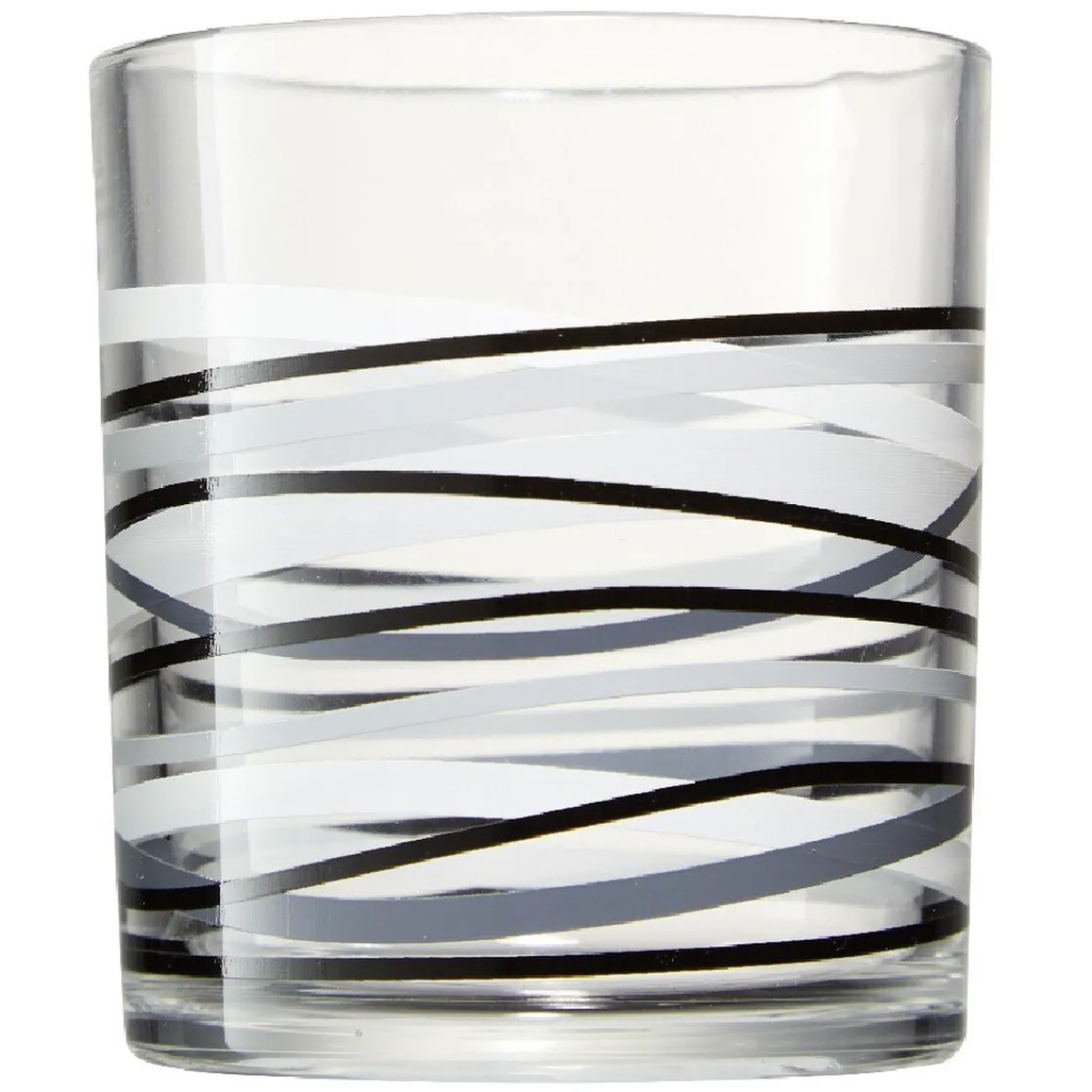 Transparents, les verres sont décorés d’un motif aux rayures graphiques blanches, grises et noires.