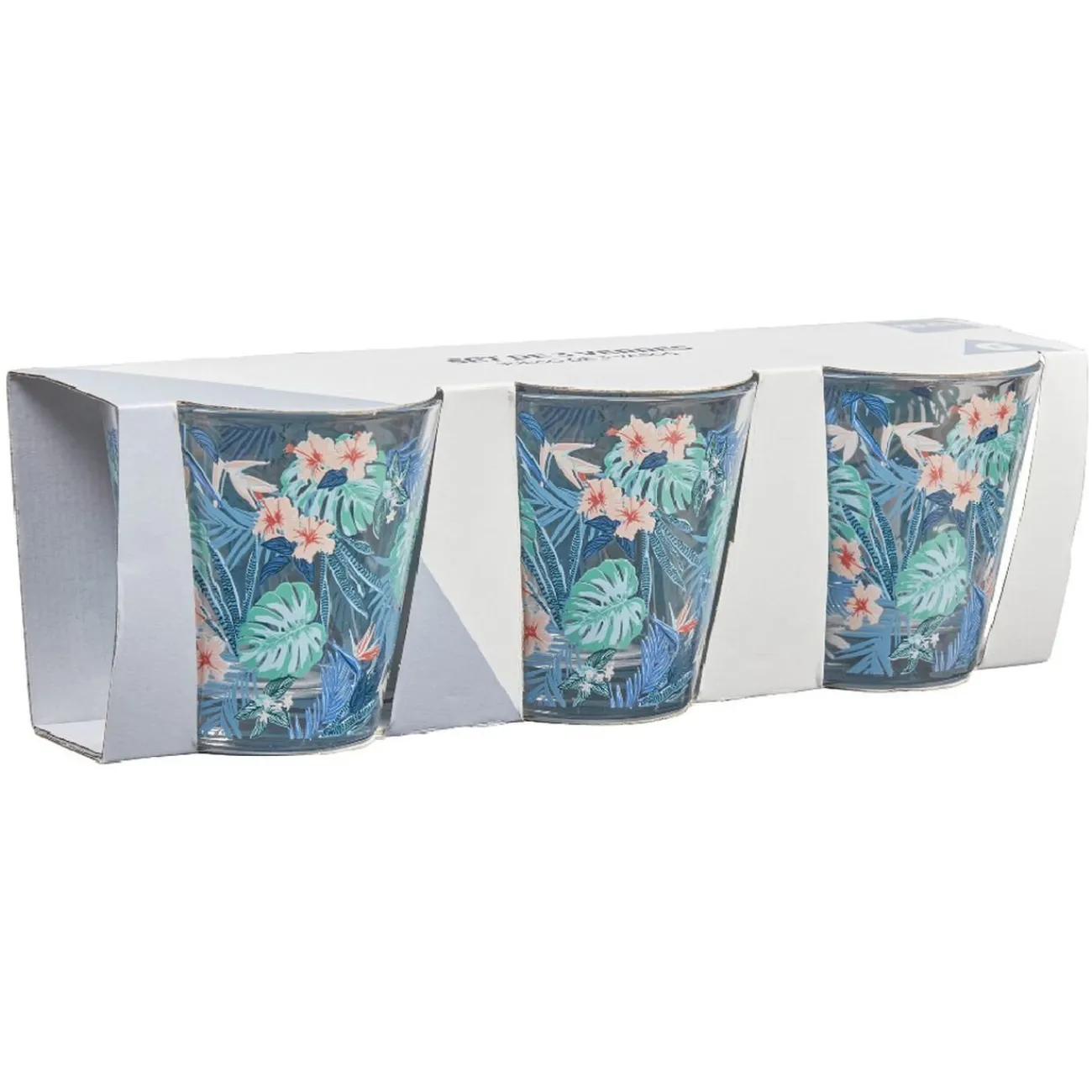 Lot de 3 verres bas Nadia Tropical au motif fleuri et coloré. Parfait pour égayer vos petits déjeuner et apéritifs.
