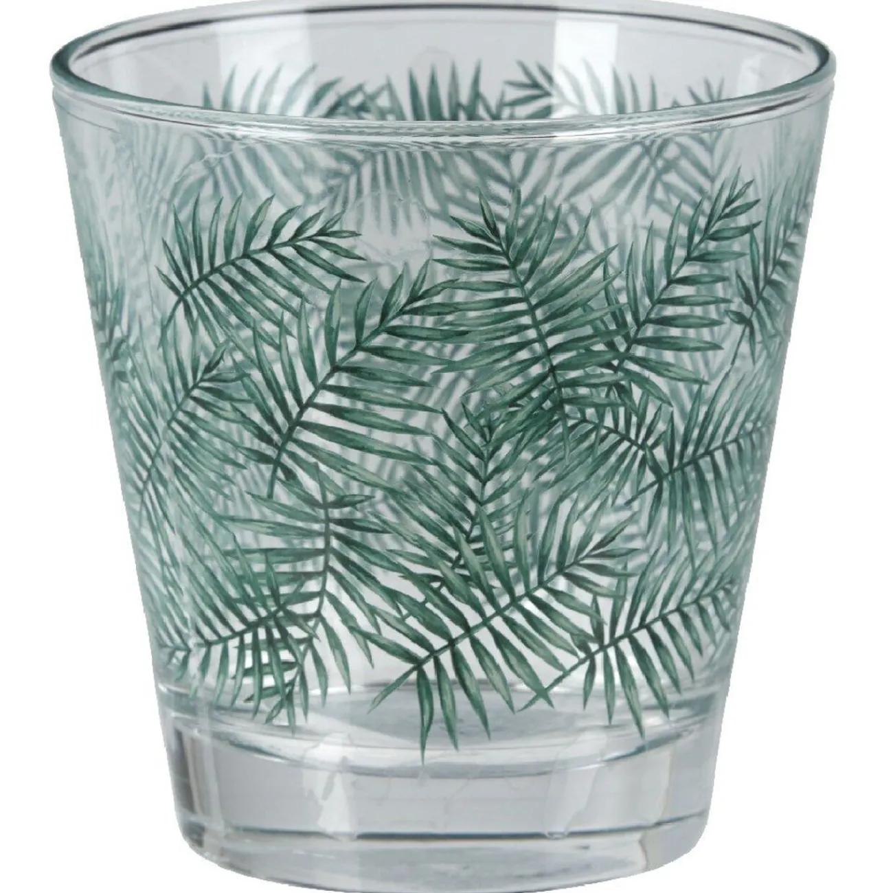 Lot de 3 verres bas 25 cl style tropical avec motifs feuillages verts sur le contour.