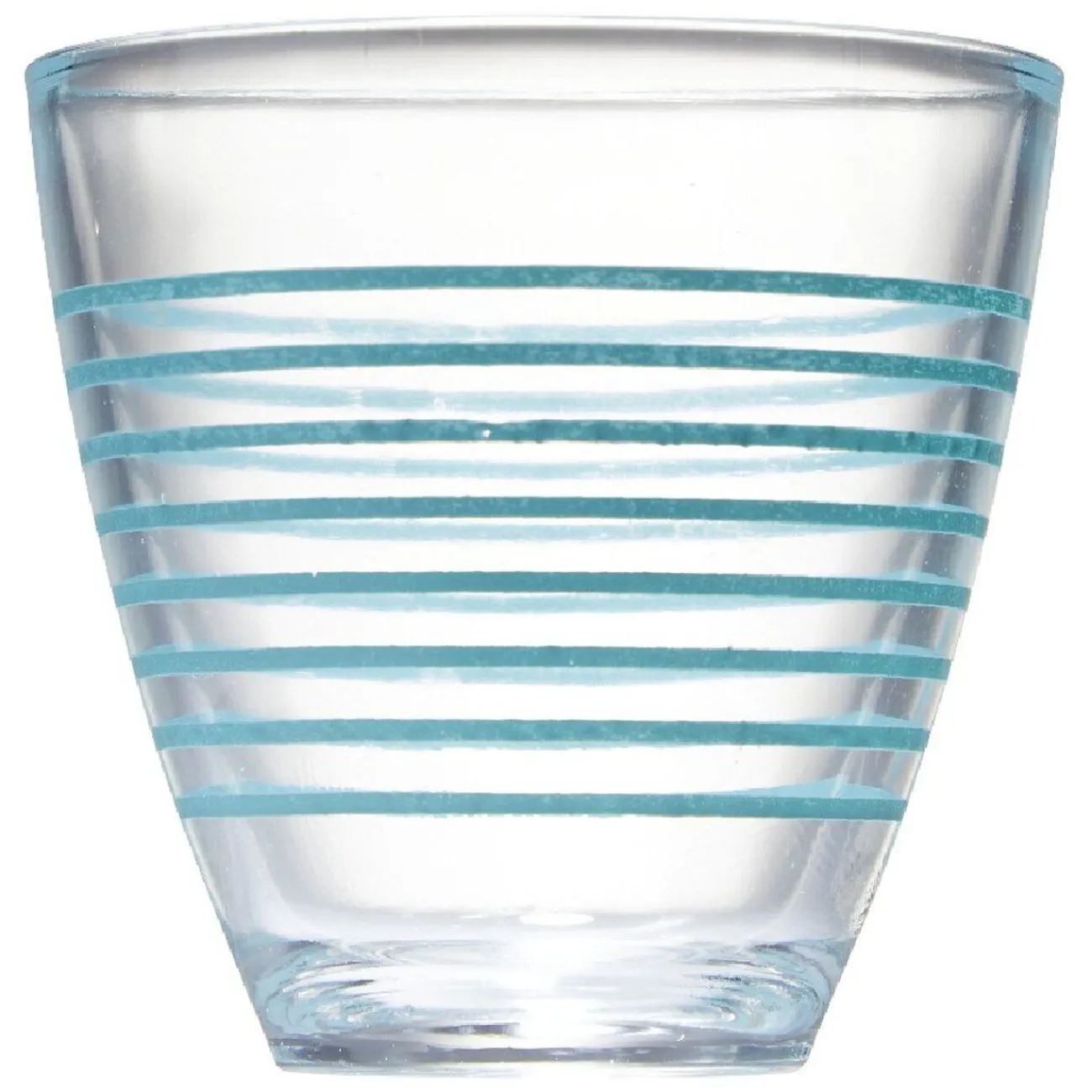 Lot de 12 verres bas transparents décorés de rayures bleues.
