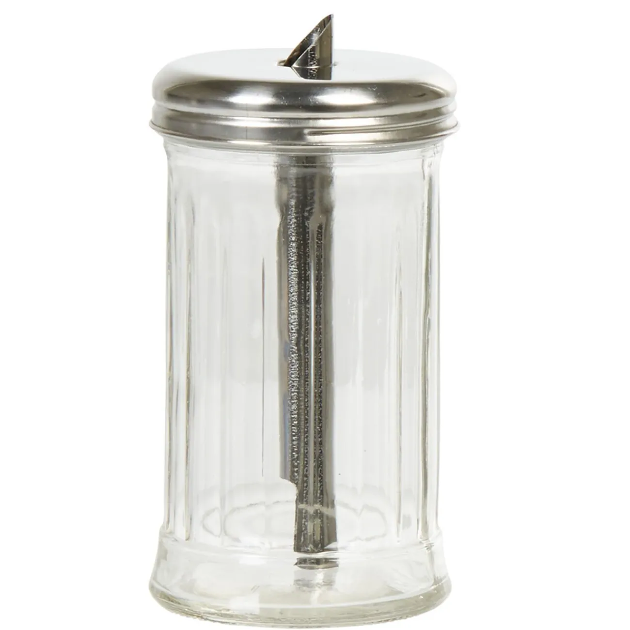 Verseuse à sucre ø 7,5×13 cm, en verre transparent et couvercle métallique.
